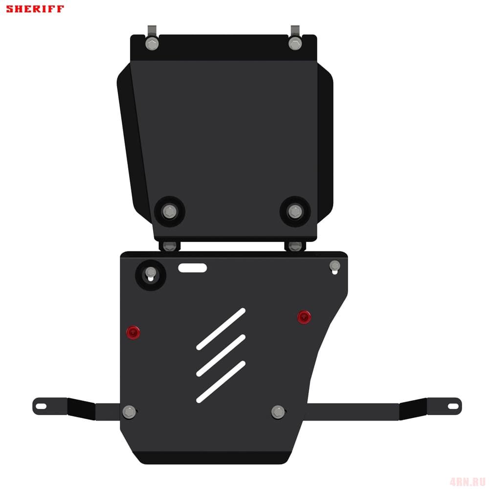 Защита картера Sheriff нужна для сохранности узлов и агрегатов, находящихся на днище авто. Она надежно защитит двигательный отсек вашей машины от повреждений. Также она защищает моторный отсек от влаги, грязи, и предусматривает наличие металлических крыльев, которые выполняют функцию пыльника.