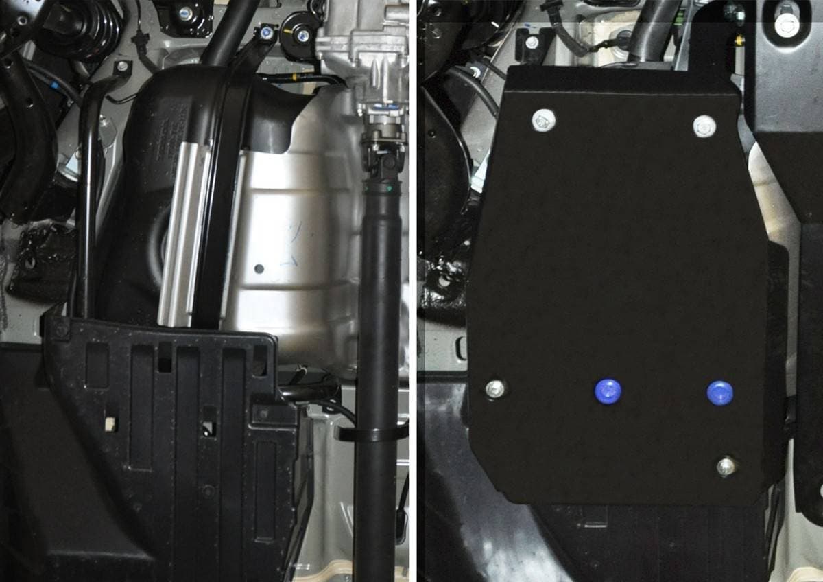 Порошковое окрашивание гарантирует долгий срок службы. А глубокий штамп увеличивает жесткость до 2,5 раз. Также имеется утопленный крепеж для предотвращения срывов. Качественная покраска защиты картера выдерживает 720 часов соляного тумана. Толщина изделия составляет 2-6 мм. Подштамповка в местах крепления предохраняет крепеж от срезания. Деталь спроектирована индивидуально для вашего автомобиля, что позволяет устанавливать ее в штатные места без доработки кузова за 10 мин.