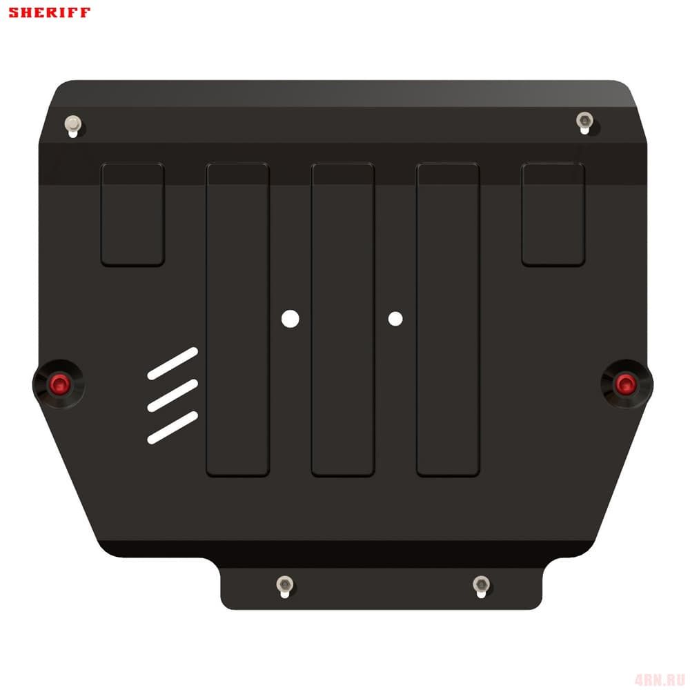 Защита картера Sheriff нужна для сохранности узлов и агрегатов, находящихся на днище авто. Она надежно защитит двигательный отсек вашей машины от повреждений. Также она защищает моторный отсек от влаги, грязи, и предусматривает наличие металлических крыльев, которые выполняют функцию пыльника.