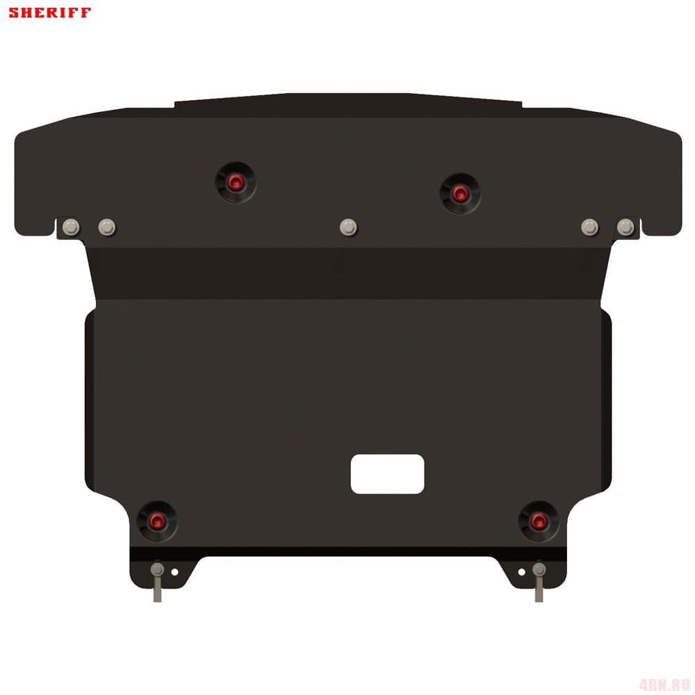 Защита картера Sheriff нужна для сохранности узлов и агрегатов, находящихся на днище авто. Она надежно защитит двигательный отсек вашей машины от повреждений. Также она защищает моторный отсек от влаги, грязи, и предусматривает наличие металлических крыльев, которые выполняют функцию пыльника.