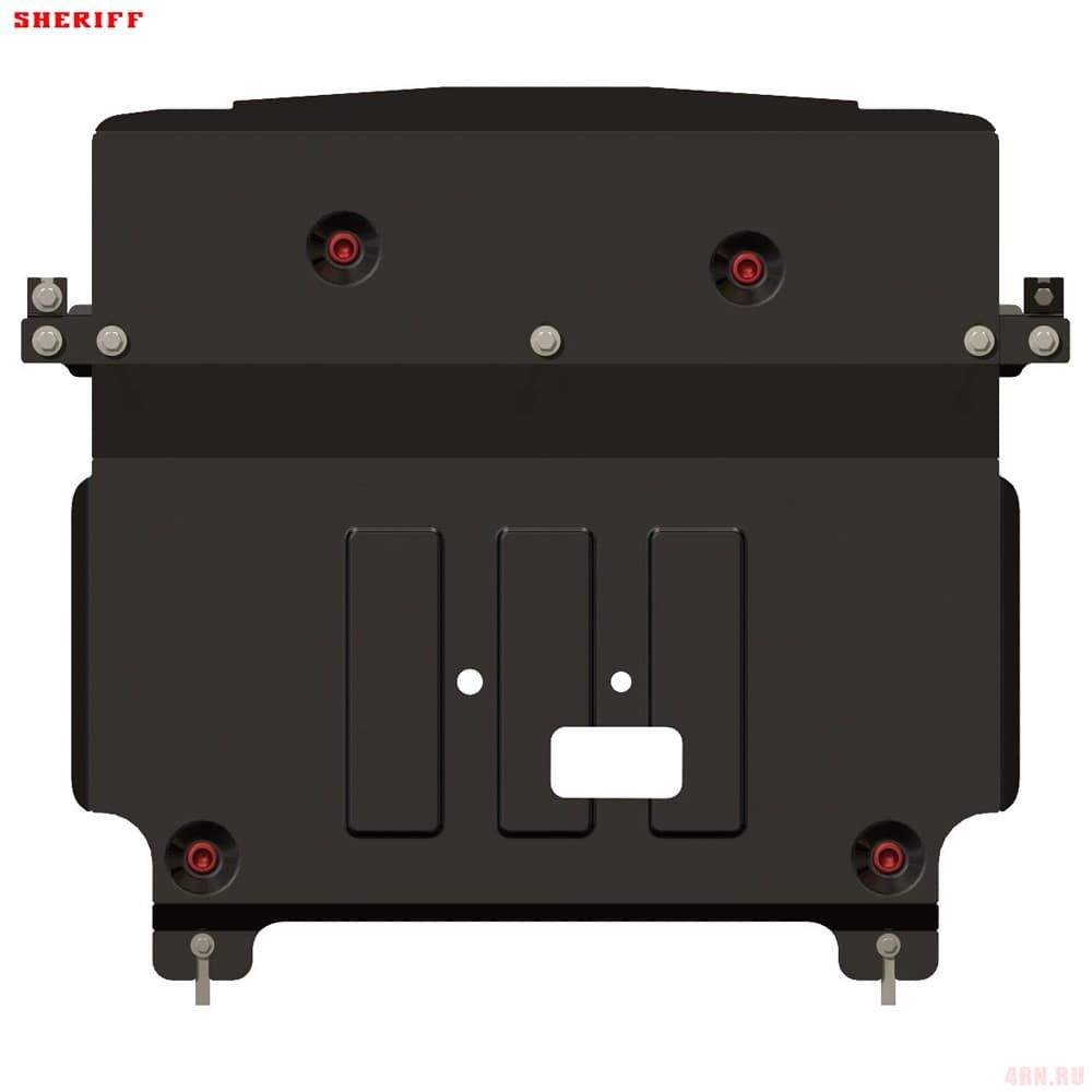 Защита картера Sheriff нужна для сохранности узлов и агрегатов, находящихся на днище авто. Она надежно защитит двигательный отсек вашей машины от повреждений. Также она защищает моторный отсек от влаги, грязи, и предусматривает наличие металлических крыльев, которые выполняют функцию пыльника.