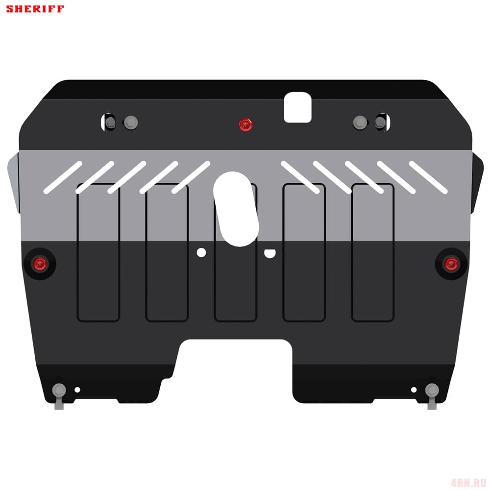 Защита картера Sheriff нужна для сохранности узлов и агрегатов, находящихся на днище авто. Она надежно защитит двигательный отсек вашей машины от повреждений. Также она защищает моторный отсек от влаги, грязи, и предусматривает наличие металлических крыльев, которые выполняют функцию пыльника.