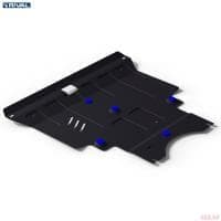 Порошковое окрашивание гарантирует долгий срок службы. А глубокий штамп увеличивает жесткость до 2,5 раз. Также имеется утопленный крепеж для предотвращения срывов. Качественная покраска защиты картера выдерживает 720 часов соляного тумана. Толщина изделия составляет 2-6 мм. Подштамповка в местах крепления предохраняет крепеж от срезания. Деталь спроектирована индивидуально для вашего автомобиля, что позволяет устанавливать ее в штатные места без доработки кузова за 10 мин.