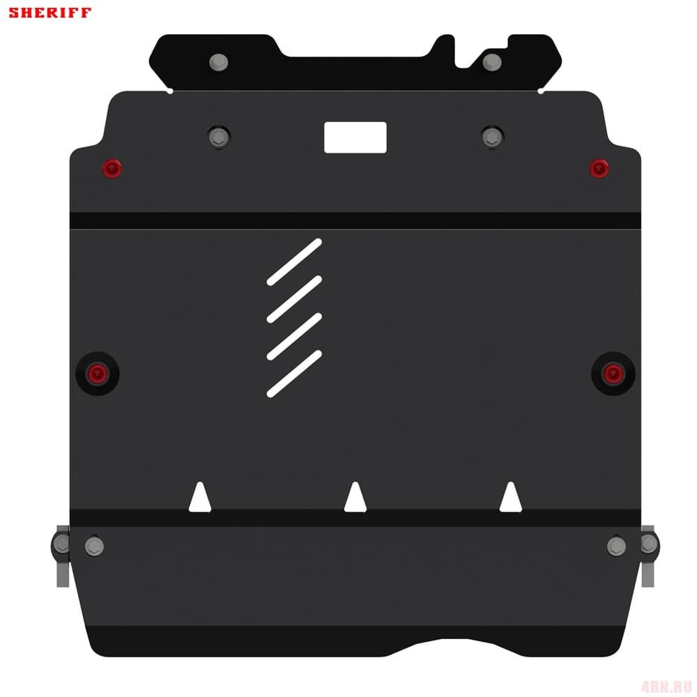 Защита картера Sheriff нужна для сохранности узлов и агрегатов, находящихся на днище авто. Она надежно защитит двигательный отсек вашей машины от повреждений. Также она защищает моторный отсек от влаги, грязи, и предусматривает наличие металлических крыльев, которые выполняют функцию пыльника.