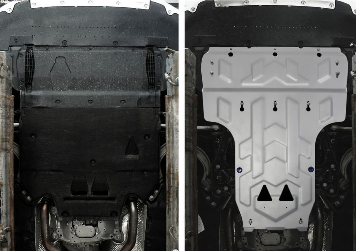 Стойкое порошковое окрашивание позволяет сохранить внешний вид, защитит от царапин, предотвратит коррозию. Также имеется утопленный крепеж для предотвращения срывов. Крепеж не образует с алюминием гальваническую пару. Защита спроектирована индивидуально для автомобиля, что позволяет устанавливать ее в штатные места без доработки кузова за 10 мин.