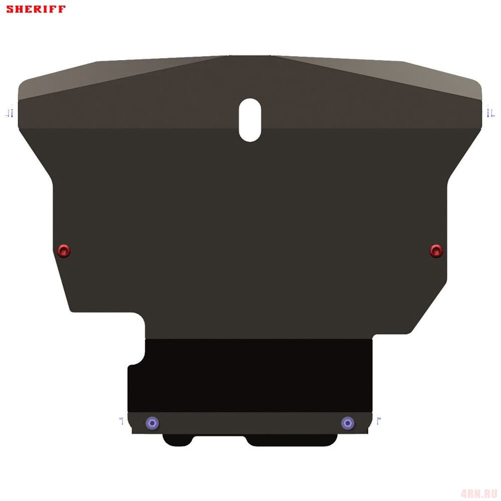 Защита картера Sheriff нужна для сохранности узлов и агрегатов, находящихся на днище авто. Она надежно защитит двигательный отсек вашей машины от повреждений. Также она защищает моторный отсек от влаги, грязи, и предусматривает наличие металлических крыльев, которые выполняют функцию пыльника.