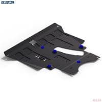 Порошковое окрашивание гарантирует долгий срок службы. А глубокий штамп увеличивает жесткость до 2,5 раз. Также имеется утопленный крепеж для предотвращения срывов. Качественная покраска защиты картера выдерживает 720 часов соляного тумана. Толщина изделия составляет 2-6 мм. Подштамповка в местах крепления предохраняет крепеж от срезания. Деталь спроектирована индивидуально для вашего автомобиля, что позволяет устанавливать ее в штатные места без доработки кузова за 10 мин.