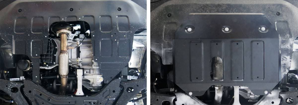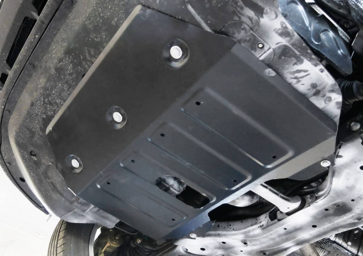 Порошковое окрашивание гарантирует долгий срок службы. А глубокий штамп увеличивает жесткость до 2,5 раз. Также имеется утопленный крепеж для предотвращения срывов. Качественная покраска защиты картера выдерживает 720 часов соляного тумана. Толщина изделия составляет 2-6 мм. Подштамповка в местах крепления предохраняет крепеж от срезания. Деталь спроектирована индивидуально для вашего автомобиля, что позволяет устанавливать ее в штатные места без доработки кузова за 10 мин.