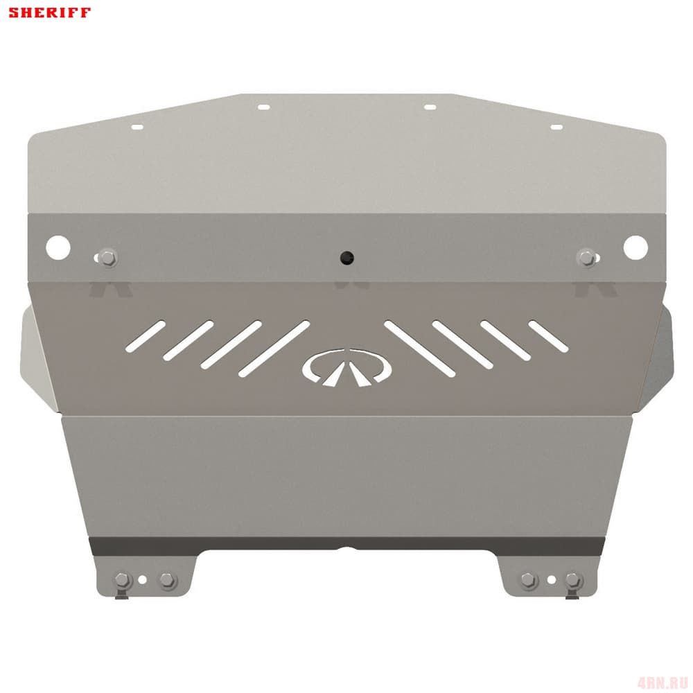 Алюминиевая защита двигателя с крепежом в комплекте, артикул 15.1180 от российского производителя Шериф. Разработана специально для автомобиля Инфинити QX50 2014-2017.