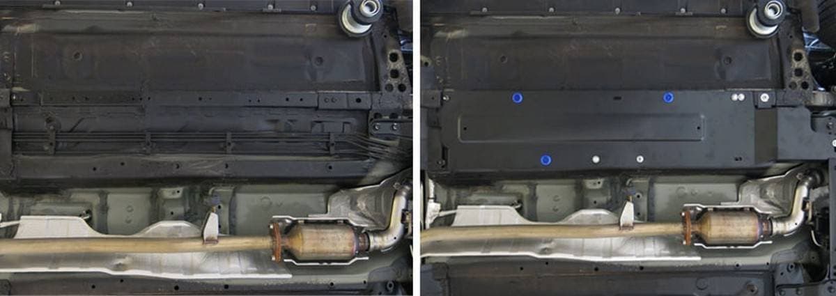 Порошковое окрашивание гарантирует долгий срок службы. А глубокий штамп увеличивает жесткость до 2,5 раз. Также имеется утопленный крепеж для предотвращения срывов. Качественная покраска защиты картера выдерживает 720 часов соляного тумана. Толщина изделия составляет 2-6 мм. Подштамповка в местах крепления предохраняет крепеж от срезания. Деталь спроектирована индивидуально для вашего автомобиля, что позволяет устанавливать ее в штатные места без доработки кузова за 10 мин.