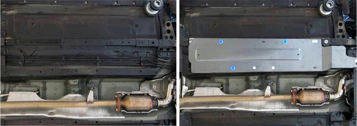Стойкое порошковое окрашивание позволяет сохранить внешний вид, защитит от царапин, предотвратит коррозию. Также имеется утопленный крепеж для предотвращения срывов. Крепеж не образует с алюминием гальваническую пару. Защита спроектирована индивидуально для автомобиля, что позволяет устанавливать ее в штатные места без доработки кузова за 10 мин.