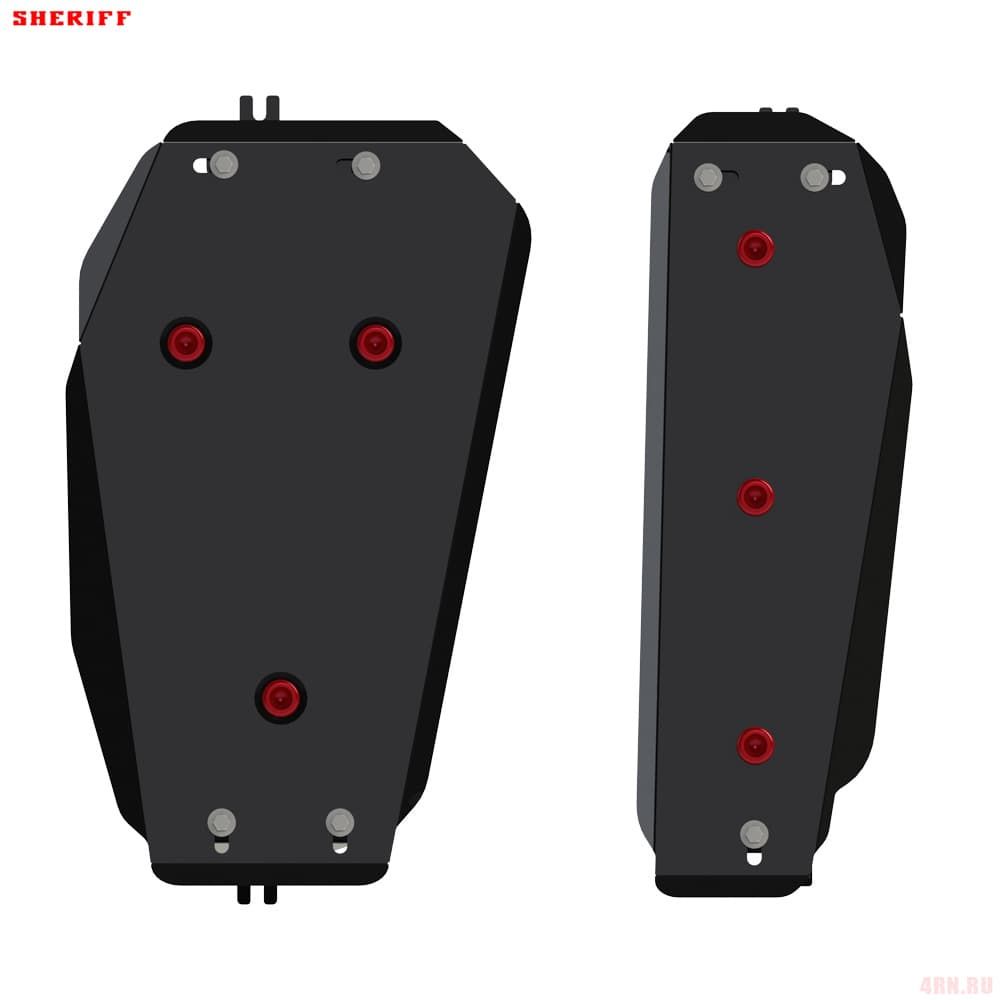Защита картера Sheriff нужна для сохранности узлов и агрегатов, находящихся на днище авто. Она надежно защитит двигательный отсек вашей машины от повреждений. Также она защищает моторный отсек от влаги, грязи, и предусматривает наличие металлических крыльев, которые выполняют функцию пыльника.