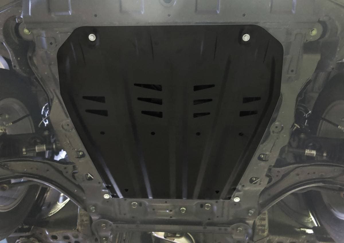 Порошковое окрашивание гарантирует долгий срок службы. А глубокий штамп увеличивает жесткость до 2,5 раз. Также имеется утопленный крепеж для предотвращения срывов. Качественная покраска защиты картера выдерживает 720 часов соляного тумана. Толщина изделия составляет 2-6 мм. Подштамповка в местах крепления предохраняет крепеж от срезания. Деталь спроектирована индивидуально для вашего автомобиля, что позволяет устанавливать ее в штатные места без доработки кузова за 10 мин.