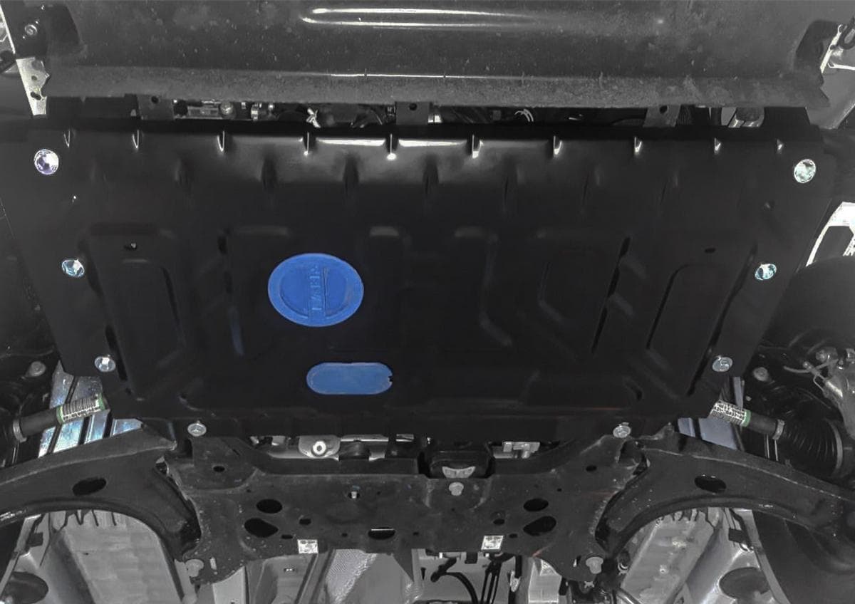 Порошковое окрашивание гарантирует долгий срок службы. А глубокий штамп увеличивает жесткость до 2,5 раз. Также имеется утопленный крепеж для предотвращения срывов. Качественная покраска защиты картера выдерживает 720 часов соляного тумана. Толщина изделия составляет 2-6 мм. Подштамповка в местах крепления предохраняет крепеж от срезания. Деталь спроектирована индивидуально для вашего автомобиля, что позволяет устанавливать ее в штатные места без доработки кузова за 10 мин.