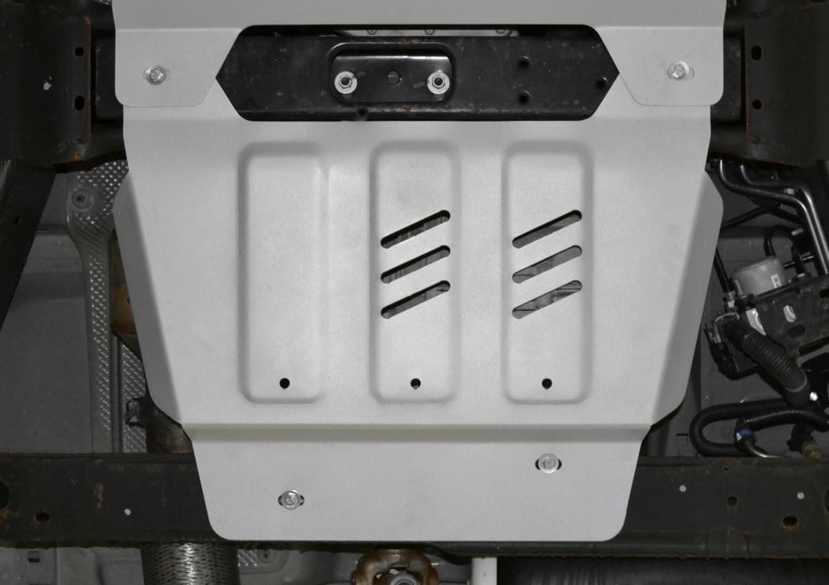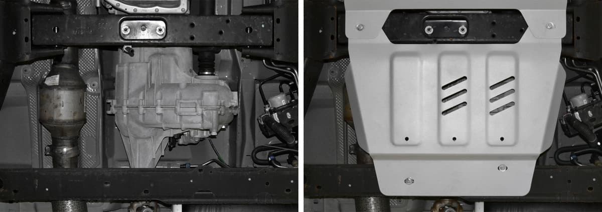 Стойкое порошковое окрашивание позволяет сохранить внешний вид, защитит от царапин, предотвратит коррозию. Также имеется утопленный крепеж для предотвращения срывов. Крепеж не образует с алюминием гальваническую пару. Защита спроектирована индивидуально для автомобиля, что позволяет устанавливать ее в штатные места без доработки кузова за 10 мин.