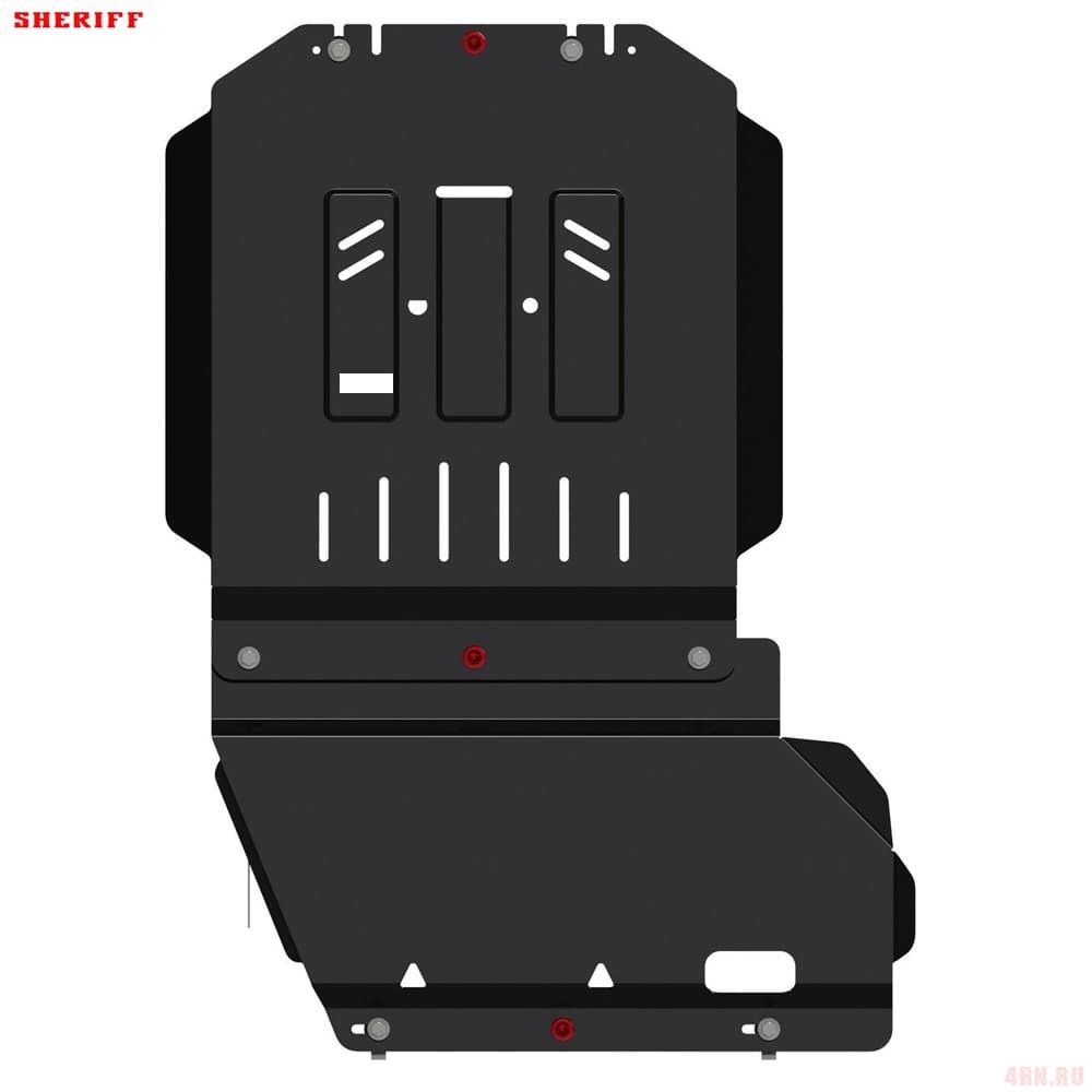 Защита картера Sheriff нужна для сохранности узлов и агрегатов, находящихся на днище авто. Она надежно защитит двигательный отсек вашей машины от повреждений. Также она защищает моторный отсек от влаги, грязи, и предусматривает наличие металлических крыльев, которые выполняют функцию пыльника.