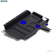 Порошковое окрашивание гарантирует долгий срок службы. А глубокий штамп увеличивает жесткость до 2,5 раз. Также имеется утопленный крепеж для предотвращения срывов. Качественная покраска защиты картера выдерживает 720 часов соляного тумана. Толщина изделия составляет 2-6 мм. Подштамповка в местах крепления предохраняет крепеж от срезания. Деталь спроектирована индивидуально для вашего автомобиля, что позволяет устанавливать ее в штатные места без доработки кузова за 10 мин.