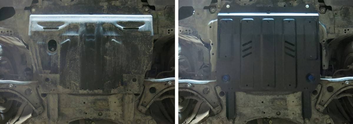 Порошковое окрашивание гарантирует долгий срок службы. А глубокий штамп увеличивает жесткость до 2,5 раз. Также имеется утопленный крепеж для предотвращения срывов. Качественная покраска защиты картера выдерживает 720 часов соляного тумана. Толщина изделия составляет 2-6 мм. Подштамповка в местах крепления предохраняет крепеж от срезания. Деталь спроектирована индивидуально для вашего автомобиля, что позволяет устанавливать ее в штатные места без доработки кузова за 10 мин.