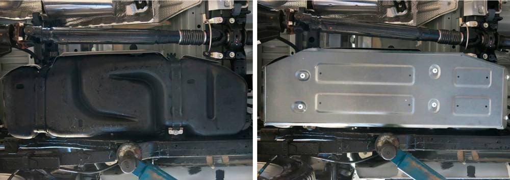 Стойкое порошковое окрашивание позволяет сохранить внешний вид, защитит от царапин, предотвратит коррозию. Также имеется утопленный крепеж для предотвращения срывов. Крепеж не образует с алюминием гальваническую пару. Защита спроектирована индивидуально для автомобиля, что позволяет устанавливать ее в штатные места без доработки кузова за 10 мин.