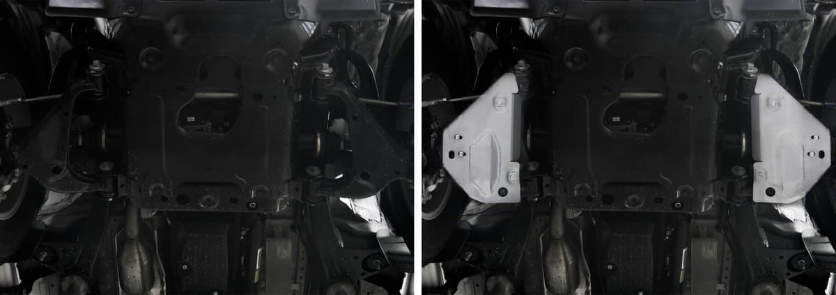 Стойкое порошковое окрашивание позволяет сохранить внешний вид, защитит от царапин, предотвратит коррозию. Также имеется утопленный крепеж для предотвращения срывов. Крепеж не образует с алюминием гальваническую пару. Защита спроектирована индивидуально для автомобиля, что позволяет устанавливать ее в штатные места без доработки кузова за 10 мин.