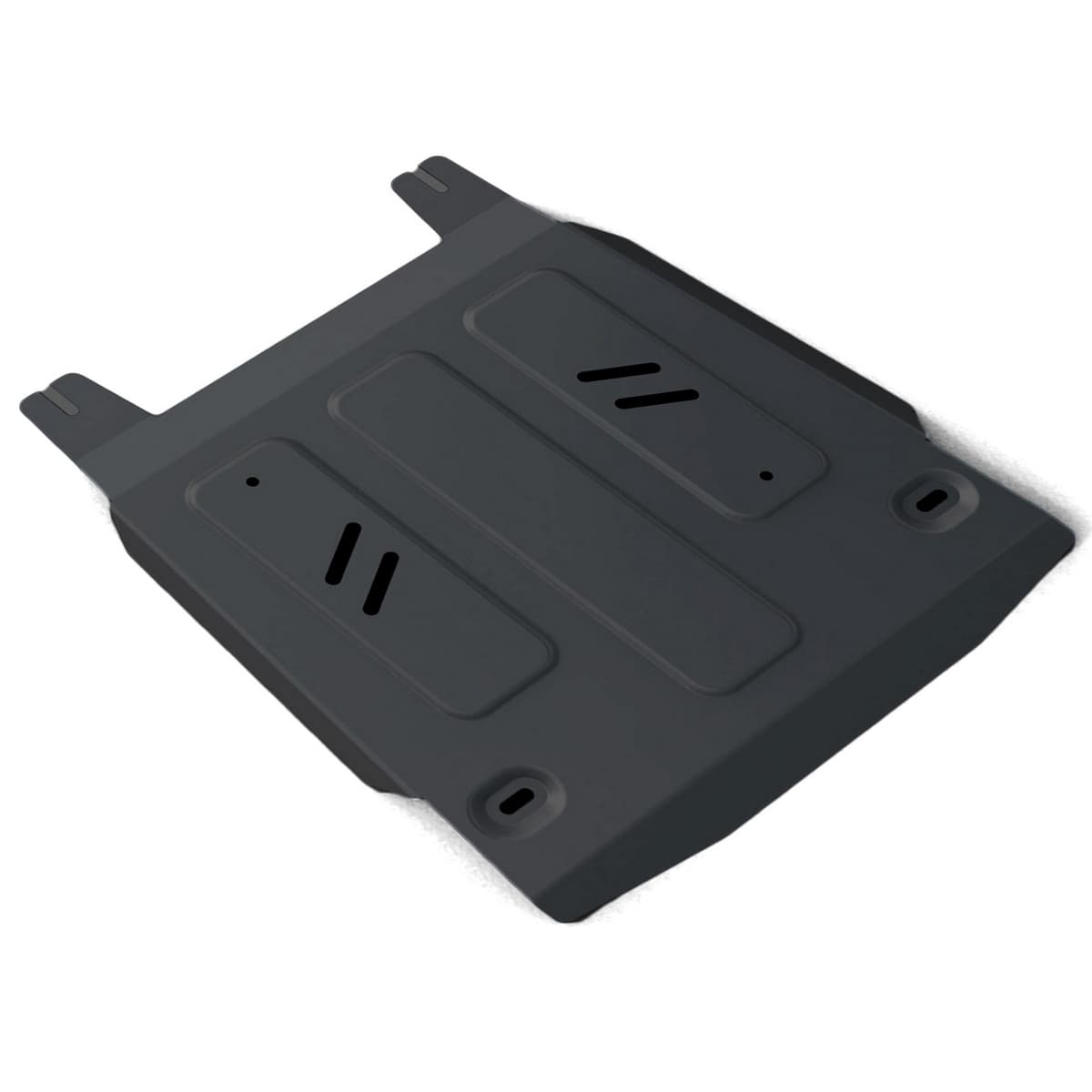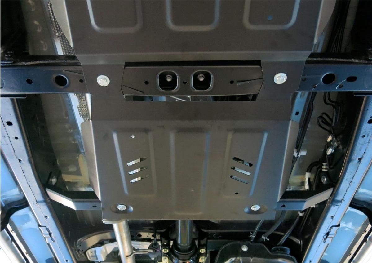 Порошковое окрашивание гарантирует долгий срок службы. А глубокий штамп увеличивает жесткость до 2,5 раз. Также имеется утопленный крепеж для предотвращения срывов. Качественная покраска защиты картера выдерживает 720 часов соляного тумана. Толщина изделия составляет 2-6 мм. Подштамповка в местах крепления предохраняет крепеж от срезания. Деталь спроектирована индивидуально для вашего автомобиля, что позволяет устанавливать ее в штатные места без доработки кузова за 10 мин.