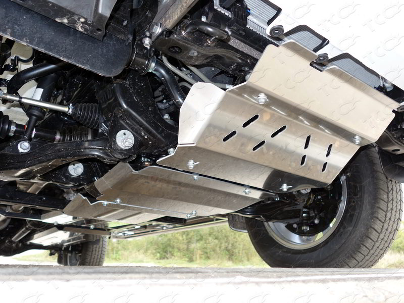 Алюминиевая защита раздаточной коробки артикул ZKTCC00032 от российского производителя ТСС. Подходит для Тойота Хайлюкс 2010-2015х годов выпуска. Защита состоит из одного листа и крепежа в комплекте, без отверстия для слива масла. Алюминия толщиной 4,0 мм достаточно для комфортного передвижения без опасений за автомобиль, вес ее 12 кг.