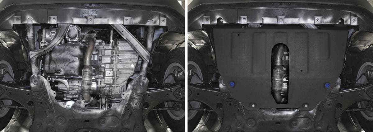 Порошковое окрашивание гарантирует долгий срок службы. А глубокий штамп увеличивает жесткость до 2,5 раз. Также имеется утопленный крепеж для предотвращения срывов. Качественная покраска защиты картера выдерживает 720 часов соляного тумана. Толщина изделия составляет 2-6 мм. Подштамповка в местах крепления предохраняет крепеж от срезания. Деталь спроектирована индивидуально для вашего автомобиля, что позволяет устанавливать ее в штатные места без доработки кузова за 10 мин.