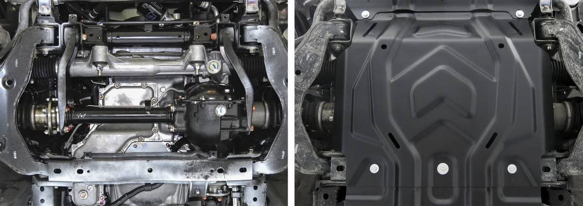 Порошковое окрашивание гарантирует долгий срок службы. А глубокий штамп увеличивает жесткость до 2,5 раз. Также имеется утопленный крепеж для предотвращения срывов. Качественная покраска защиты картера выдерживает 720 часов соляного тумана. Толщина изделия составляет 2-6 мм. Подштамповка в местах крепления предохраняет крепеж от срезания. Деталь спроектирована индивидуально для вашего автомобиля, что позволяет устанавливать ее в штатные места без доработки кузова за 10 мин.