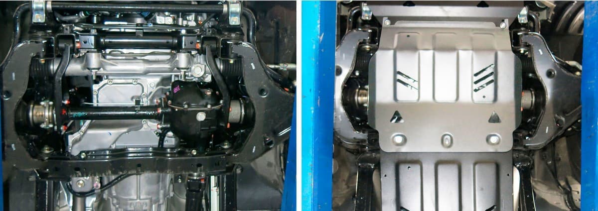 Стойкое порошковое окрашивание позволяет сохранить внешний вид, защитит от царапин, предотвратит коррозию. Также имеется утопленный крепеж для предотвращения срывов. Крепеж не образует с алюминием гальваническую пару. Защита спроектирована индивидуально для автомобиля, что позволяет устанавливать ее в штатные места без доработки кузова за 10 мин.