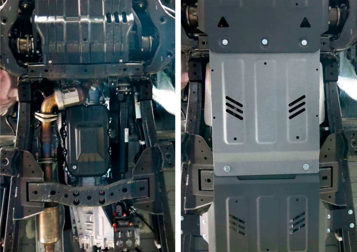 Стойкое порошковое окрашивание позволяет сохранить внешний вид, защитит от царапин, предотвратит коррозию. Также имеется утопленный крепеж для предотвращения срывов. Крепеж не образует с алюминием гальваническую пару. Защита спроектирована индивидуально для автомобиля, что позволяет устанавливать ее в штатные места без доработки кузова за 10 мин.