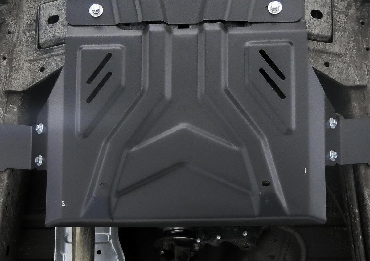 Порошковое окрашивание гарантирует долгий срок службы. А глубокий штамп увеличивает жесткость до 2,5 раз. Также имеется утопленный крепеж для предотвращения срывов. Качественная покраска защиты картера выдерживает 720 часов соляного тумана. Толщина изделия составляет 2-6 мм. Подштамповка в местах крепления предохраняет крепеж от срезания. Деталь спроектирована индивидуально для вашего автомобиля, что позволяет устанавливать ее в штатные места без доработки кузова за 10 мин.