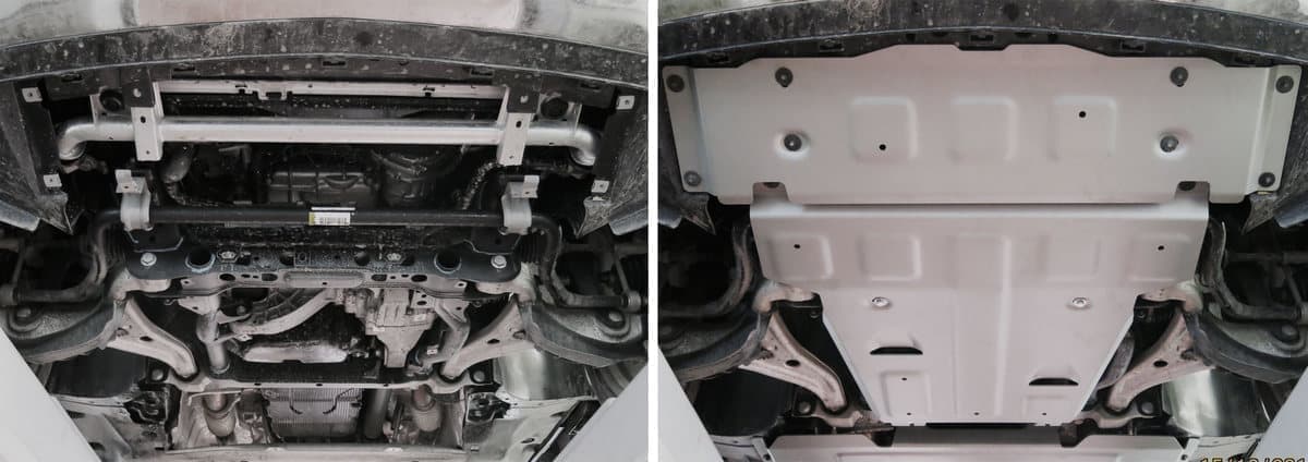 Стойкое порошковое окрашивание позволяет сохранить внешний вид, защитит от царапин, предотвратит коррозию. Также имеется утопленный крепеж для предотвращения срывов. Крепеж не образует с алюминием гальваническую пару. Защита спроектирована индивидуально для автомобиля, что позволяет устанавливать ее в штатные места без доработки кузова за 10 мин.
