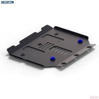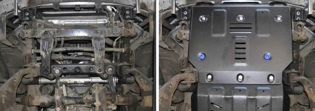 Порошковое окрашивание гарантирует долгий срок службы. А глубокий штамп увеличивает жесткость до 2,5 раз. Также имеется утопленный крепеж для предотвращения срывов. Качественная покраска защиты картера выдерживает 720 часов соляного тумана. Толщина изделия составляет 2-6 мм. Подштамповка в местах крепления предохраняет крепеж от срезания. Деталь спроектирована индивидуально для вашего автомобиля, что позволяет устанавливать ее в штатные места без доработки кузова за 10 мин.