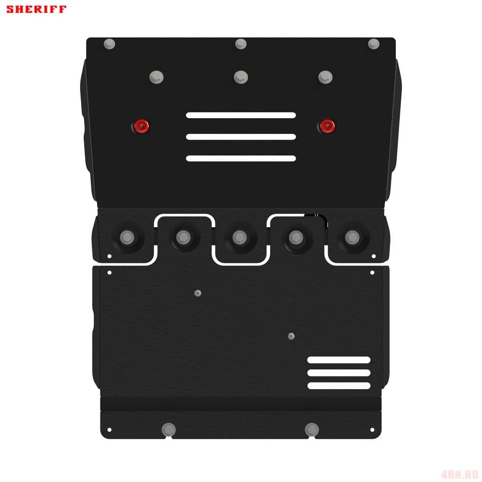 Защита картера Sheriff нужна для сохранности узлов и агрегатов, находящихся на днище авто. Она надежно защитит двигательный отсек вашей машины от повреждений. Также она защищает моторный отсек от влаги, грязи, и предусматривает наличие металлических крыльев, которые выполняют функцию пыльника.