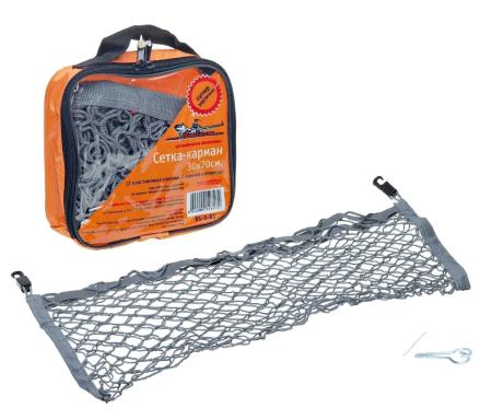 Сетка-карман в форме прямоугольника - удобный и доступный вариант для организации системы хранения в багажнике автомобиля. Сетка легко устанавливается на боковую панель машины с помощью пластиковых крючков, а также крючков-саморезов. Данная система крепежа позволяет надежно зафиксировать изделие в багажнике авто и обеспечить сохранность вещей.