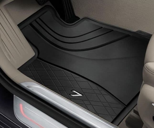 Прочные резиновые коврики с точно выдержанными размерами, высоким бортом и элегантным дизайном защищают пространство для ног в задней части салона от воды и грязи. Выполнены в черном цвете с высококачественной хромированной вставкой в форме цифры 7.