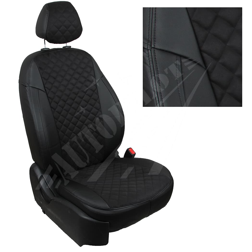 - Тыльные и боковые части чехлов сделаны из гладкой экокожи, а центральная часть из перфорированной экокожи, алькантары или велюра.