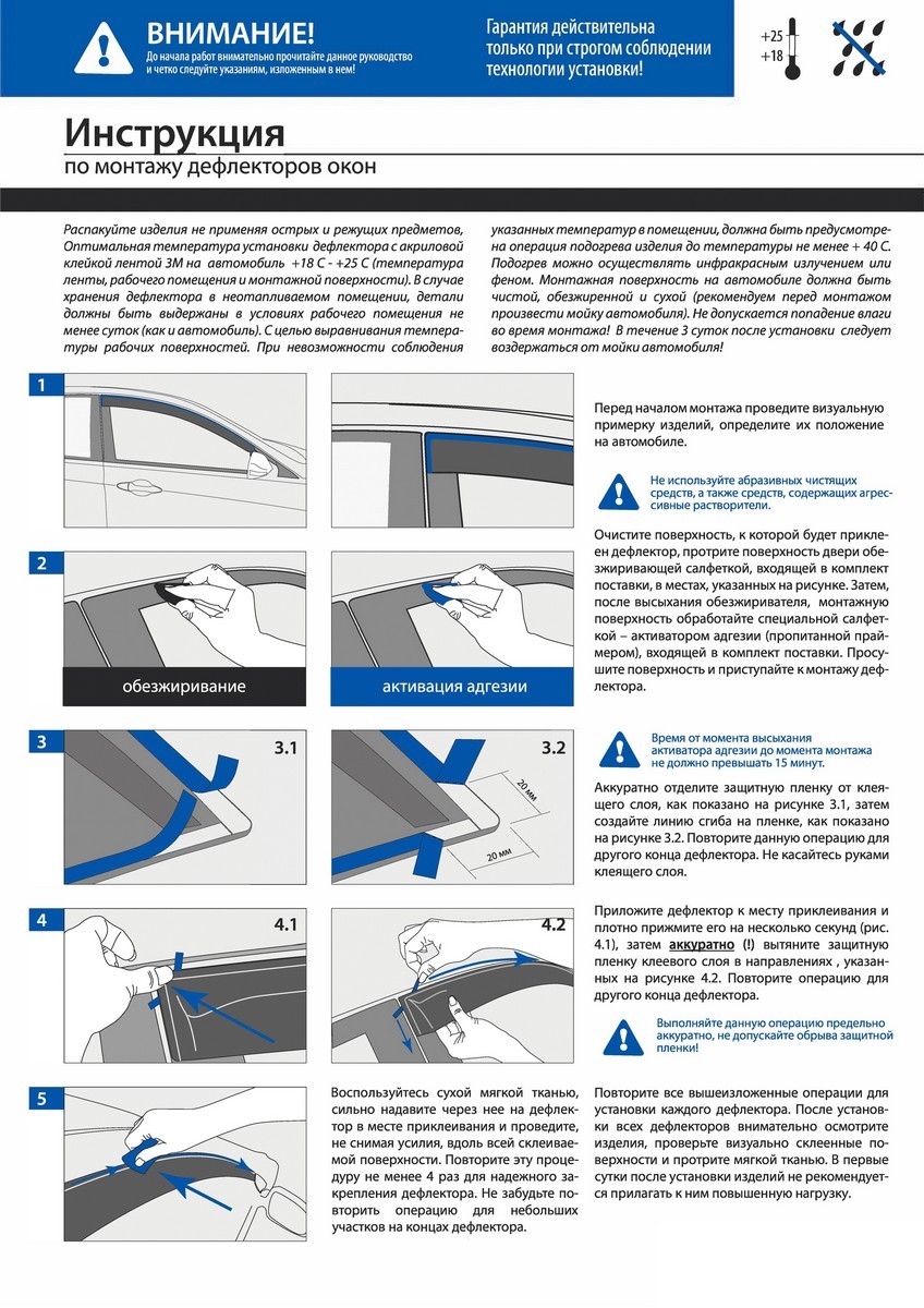 - Дефлекторы крепятся на двухсторонний скотч 3M, гарантирующий надежное сцепление поверхностей при соблюдении инструкций по установке.