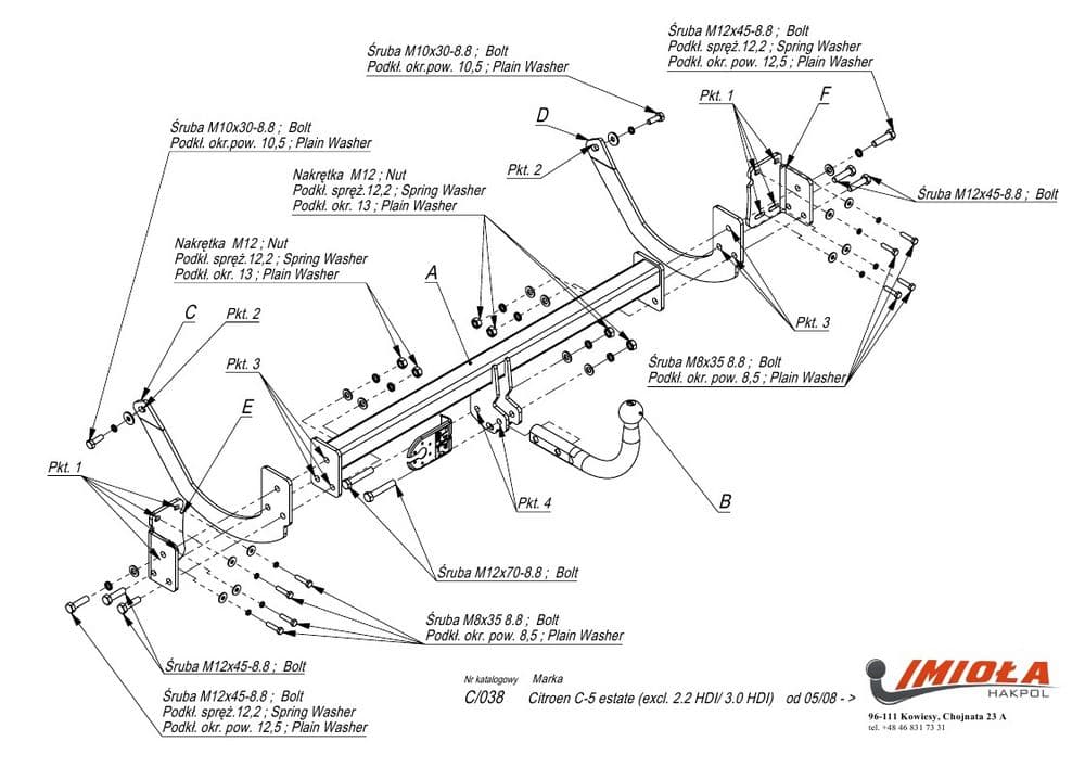 Польский фаркоп Imiola с условно съемным крюком на 2-х болтах (тип шара A), вырез в бампере при установке не нужен, электрика приобретается отдельно, максимально разрешенная масса прицепа 1900 кг.
