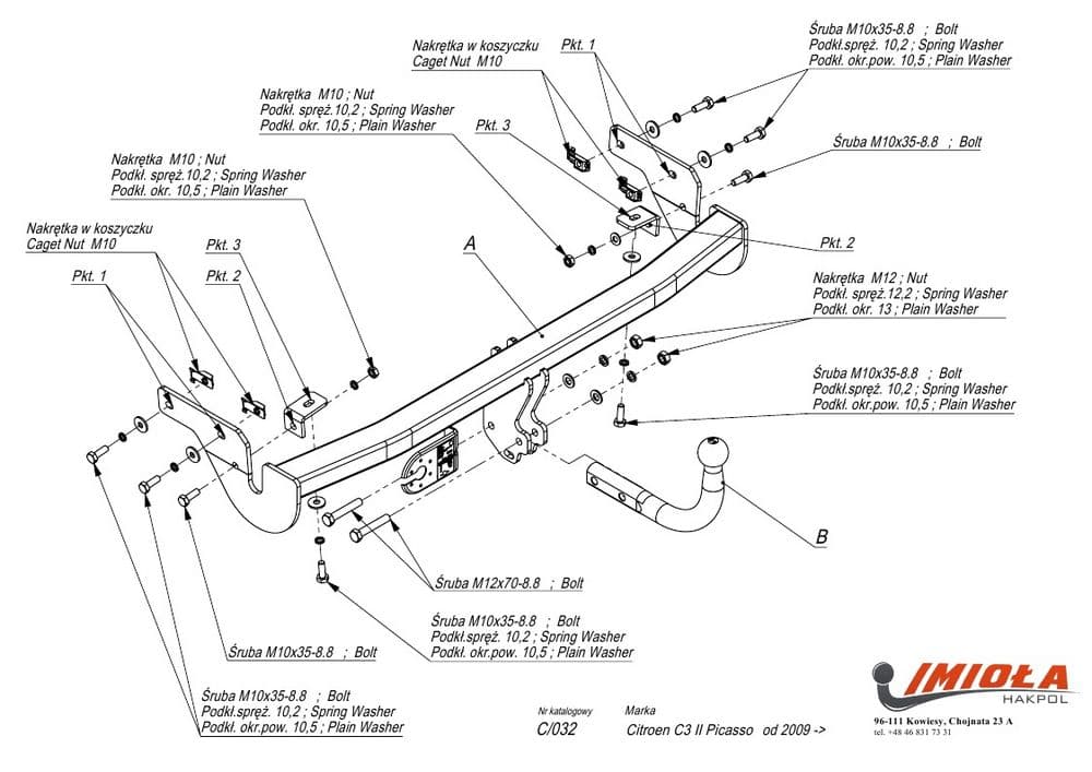 Польский фаркоп Imiola с условно съемным крюком на 2-х болтах (тип шара A), вырез в бампере при установке не нужен, электрика в комплекте, максимально разрешенная масса прицепа 1200 кг.