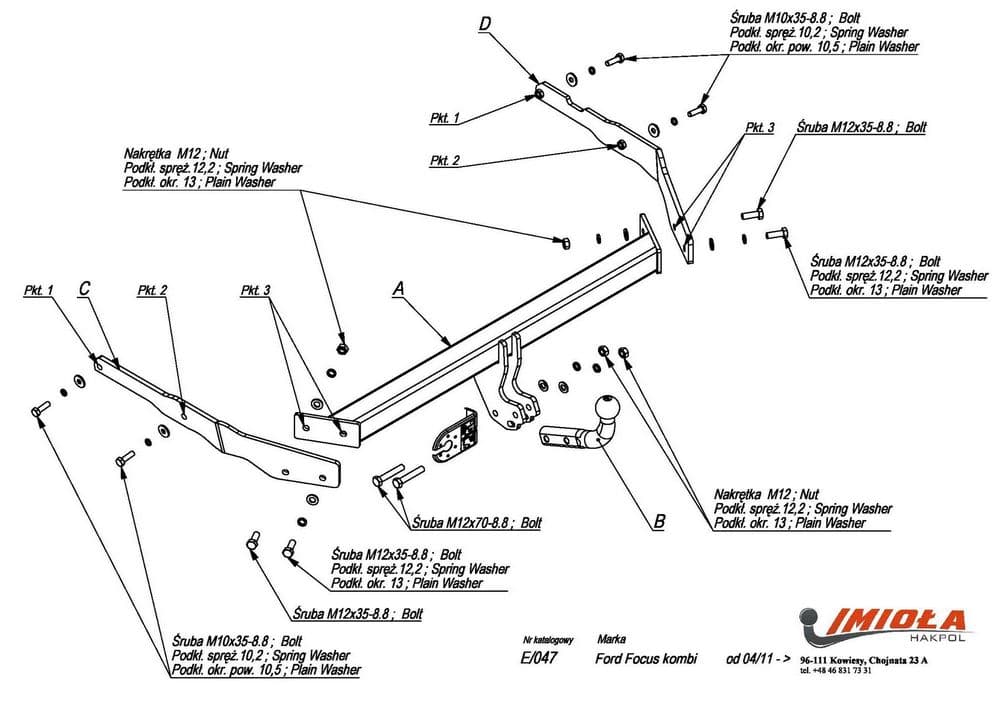 Польский фаркоп Imiola с условно съемным крюком на 2-х болтах (тип шара A), вырез в бампере при установке нужен, электрика приобретается отдельно, максимально разрешенная масса прицепа 1500 кг.