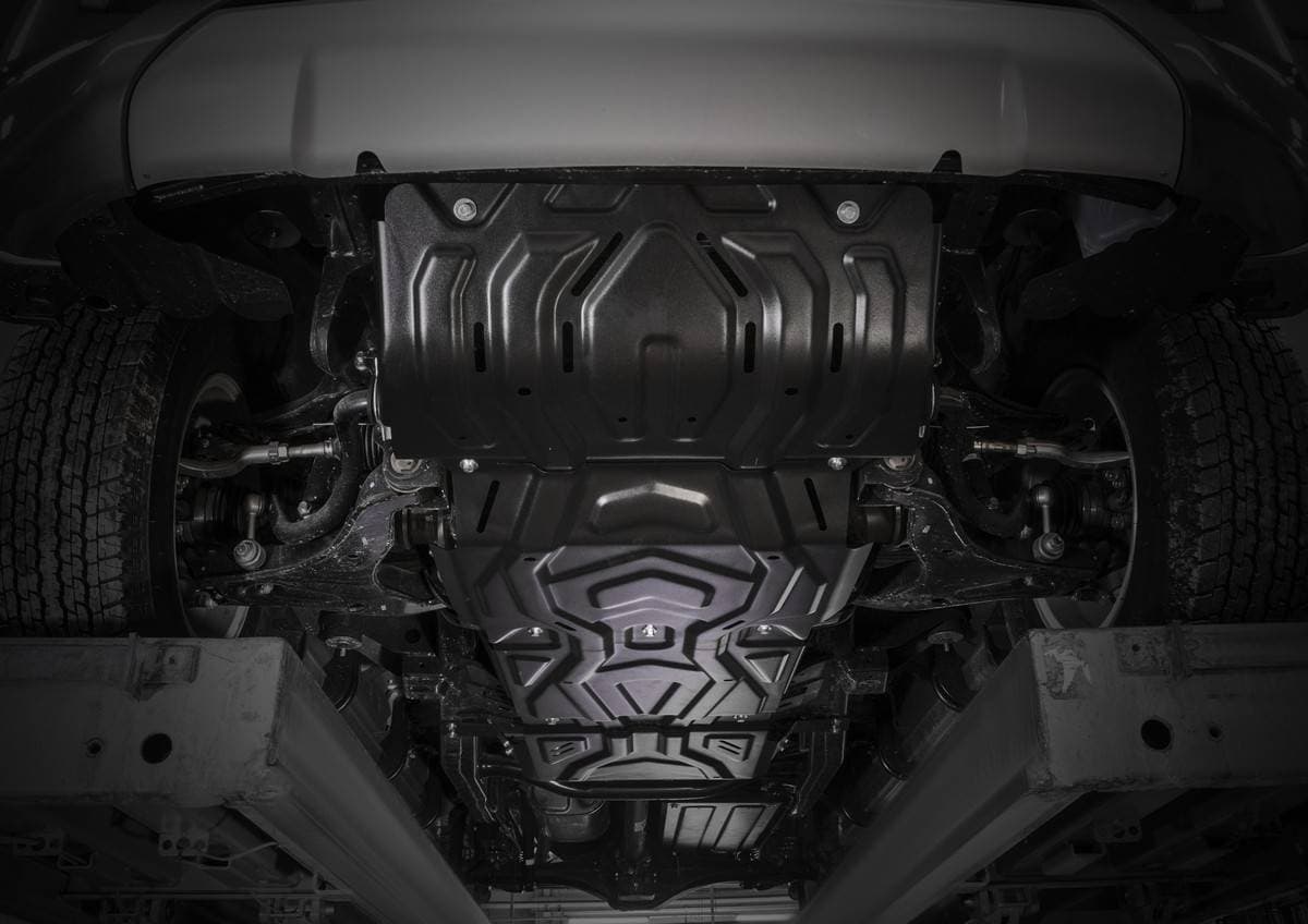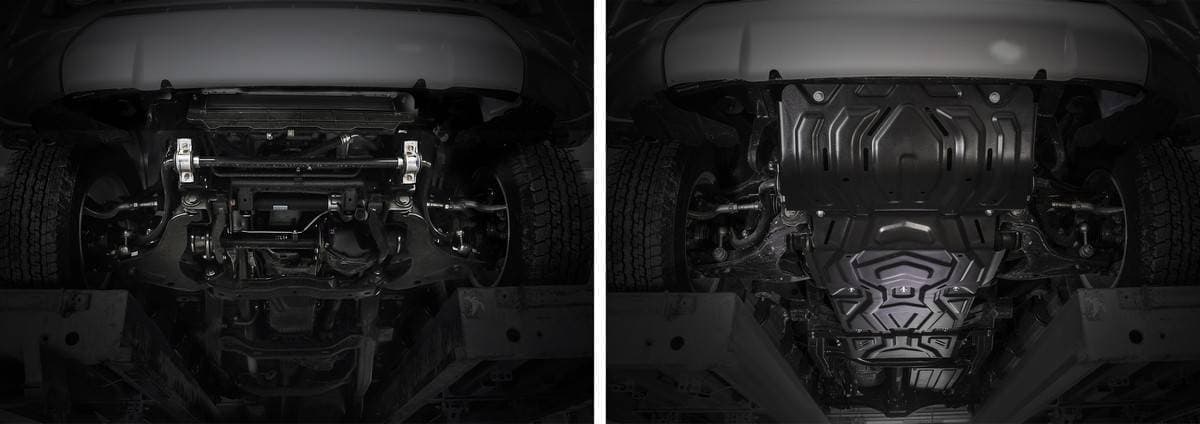 Порошковое окрашивание гарантирует долгий срок службы. А глубокий штамп увеличивает жесткость до 2,5 раз. Также имеется утопленный крепеж для предотвращения срывов. Качественная покраска защиты картера выдерживает 720 часов соляного тумана. Толщина изделия составляет 2-6 мм. Подштамповка в местах крепления предохраняет крепеж от срезания. Деталь спроектирована индивидуально для вашего автомобиля, что позволяет устанавливать ее в штатные места без доработки кузова за 10 мин.