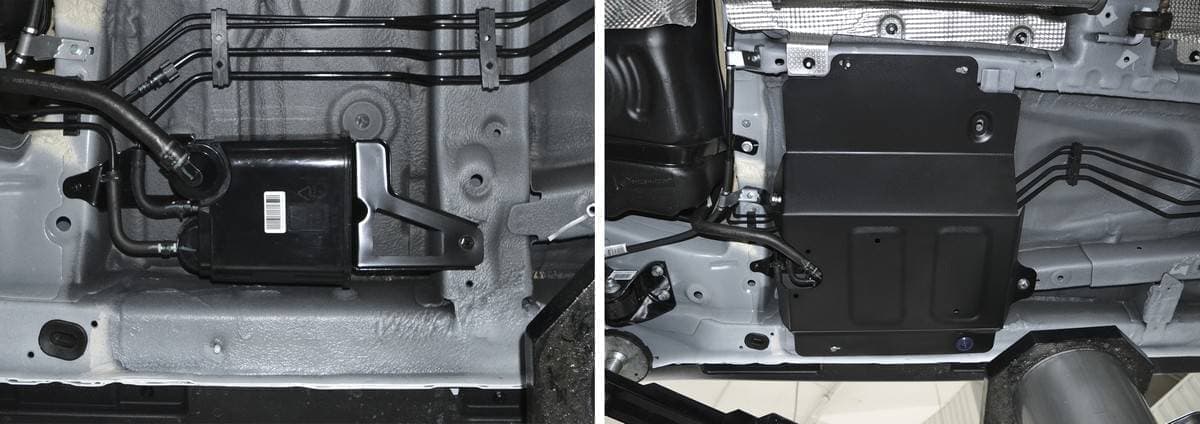 Порошковое окрашивание гарантирует долгий срок службы. А глубокий штамп увеличивает жесткость до 2,5 раз. Также имеется утопленный крепеж для предотвращения срывов. Качественная покраска защиты картера выдерживает 720 часов соляного тумана. Толщина изделия составляет 2-6 мм. Подштамповка в местах крепления предохраняет крепеж от срезания. Деталь спроектирована индивидуально для вашего автомобиля, что позволяет устанавливать ее в штатные места без доработки кузова за 10 мин.