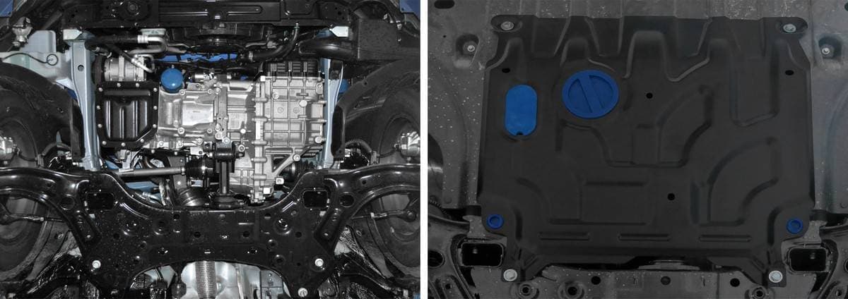 Порошковое окрашивание гарантирует долгий срок службы. А глубокий штамп увеличивает жесткость до 2,5 раз. Также имеется утопленный крепеж для предотвращения срывов. Качественная покраска защиты картера выдерживает 720 часов соляного тумана. Толщина изделия составляет 2-6 мм. Подштамповка в местах крепления предохраняет крепеж от срезания. Деталь спроектирована индивидуально для вашего автомобиля, что позволяет устанавливать ее в штатные места без доработки кузова за 10 мин.