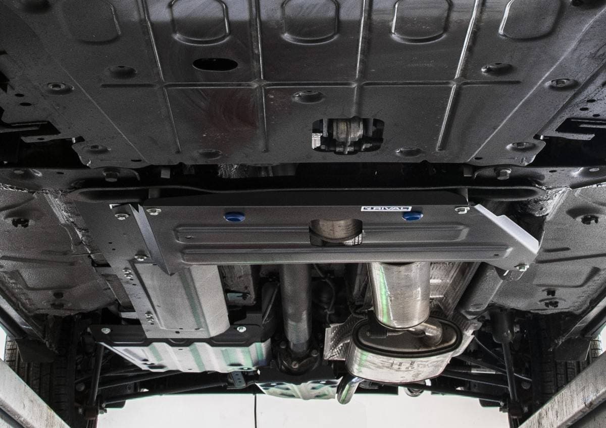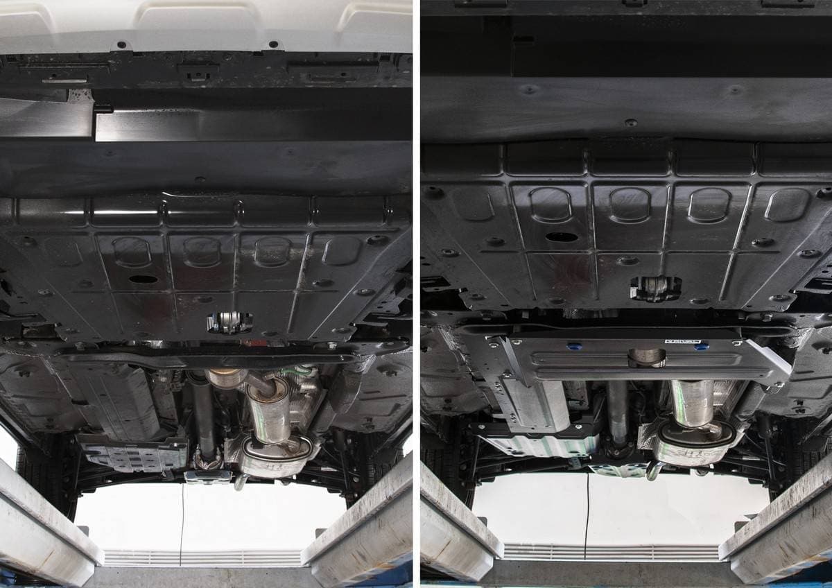 Порошковое окрашивание гарантирует долгий срок службы. А глубокий штамп увеличивает жесткость до 2,5 раз. Также имеется утопленный крепеж для предотвращения срывов. Качественная покраска защиты картера выдерживает 720 часов соляного тумана. Толщина изделия составляет 2-6 мм. Подштамповка в местах крепления предохраняет крепеж от срезания. Деталь спроектирована индивидуально для вашего автомобиля, что позволяет устанавливать ее в штатные места без доработки кузова за 10 мин.