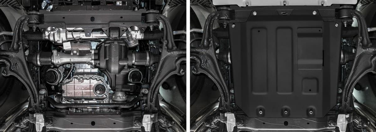 Стойкое порошковое окрашивание позволяет сохранить внешний вид, защитит от царапин, предотвратит коррозию. Также имеется утопленный крепеж для предотвращения срывов. Крепеж не образует с алюминием гальваническую пару. Защита спроектирована индивидуально для автомобиля, что позволяет устанавливать ее в штатные места без доработки кузова за 10 мин.