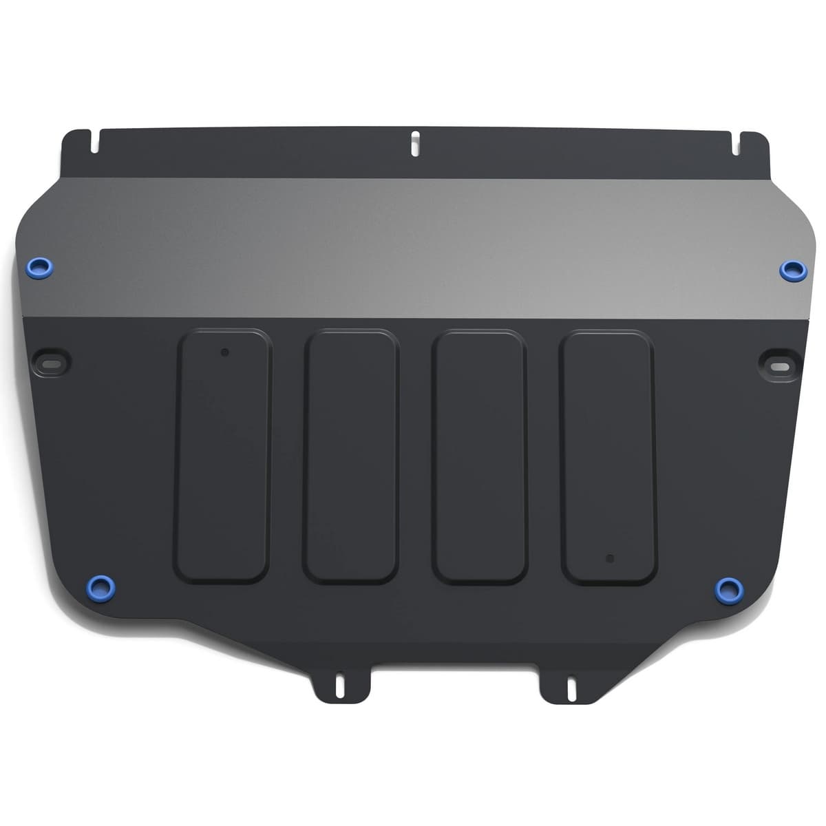 Порошковое окрашивание гарантирует долгий срок службы. А глубокий штамп увеличивает жесткость до 2,5 раз. Также имеется утопленный крепеж для предотвращения срывов. Качественная покраска защиты картера выдерживает 720 часов соляного тумана. Толщина изделия составляет 2-6 мм. Подштамповка в местах крепления предохраняет крепеж от срезания. Деталь спроектирована индивидуально для вашего автомобиля, что позволяет устанавливать ее в штатные места без доработки кузова за 10 мин.