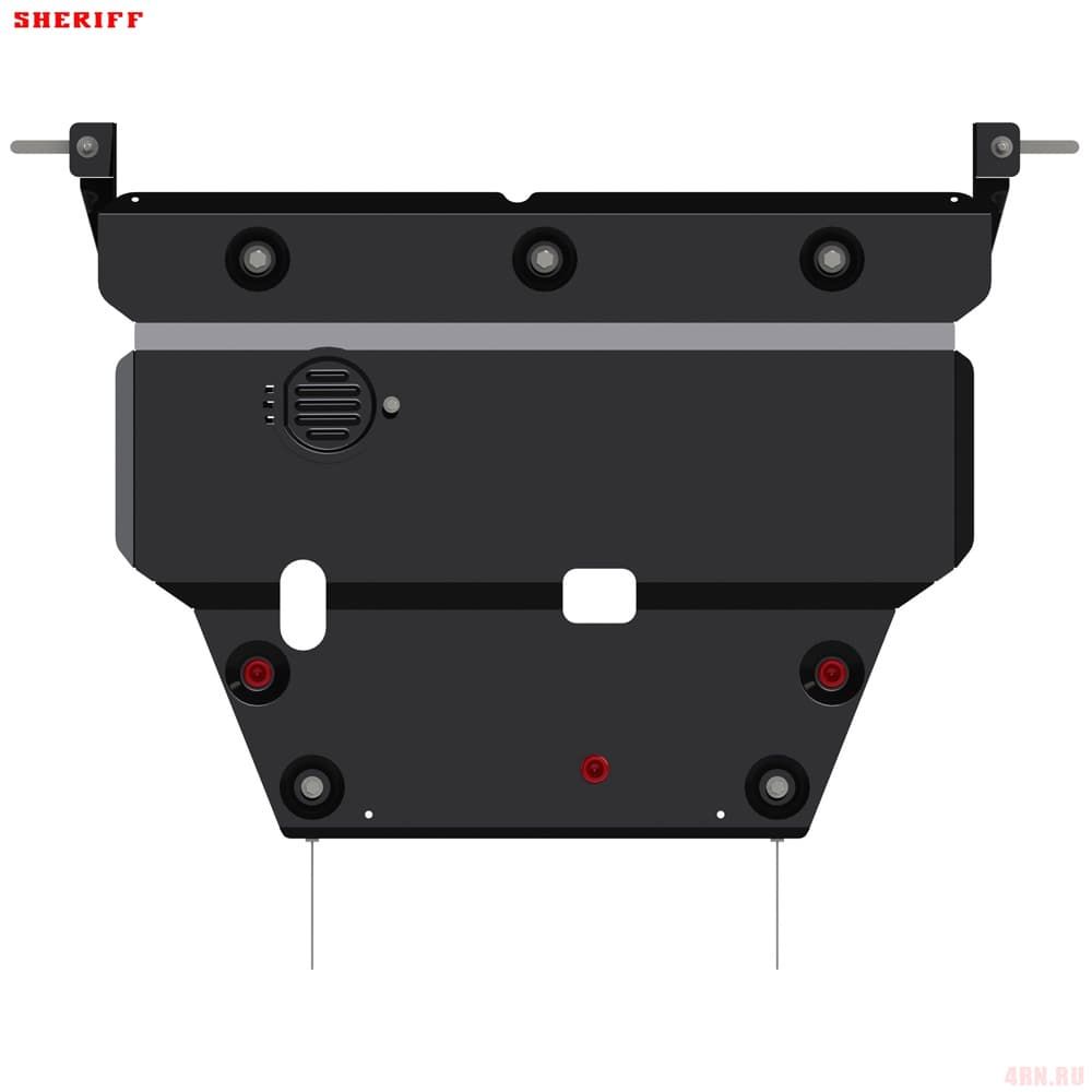 Защита картера Sheriff нужна для сохранности узлов и агрегатов, находящихся на днище авто. Она надежно защитит двигательный отсек вашей машины от повреждений. Также она защищает моторный отсек от влаги, грязи, и предусматривает наличие металлических крыльев, которые выполняют функцию пыльника.