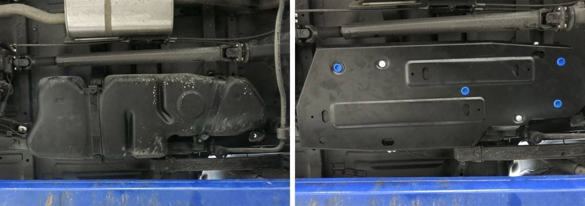 Порошковое окрашивание гарантирует долгий срок службы. А глубокий штамп увеличивает жесткость до 2,5 раз. Также имеется утопленный крепеж для предотвращения срывов. Качественная покраска защиты картера выдерживает 720 часов соляного тумана. Толщина изделия составляет 2-6 мм. Подштамповка в местах крепления предохраняет крепеж от срезания. Деталь спроектирована индивидуально для вашего автомобиля, что позволяет устанавливать ее в штатные места без доработки кузова за 10 мин.