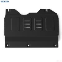 Порошковое окрашивание гарантирует долгий срок службы. А глубокий штамп увеличивает жесткость до 2,5 раз. Также имеется утопленный крепеж для предотвращения срывов. Качественная покраска защиты картера выдерживает 720 часов соляного тумана. Толщина изделия составляет 2-6 мм. Подштамповка в местах крепления предохраняет крепеж от срезания. Деталь спроектирована индивидуально для вашего автомобиля, что позволяет устанавливать ее в штатные места без доработки кузова за 10 мин.